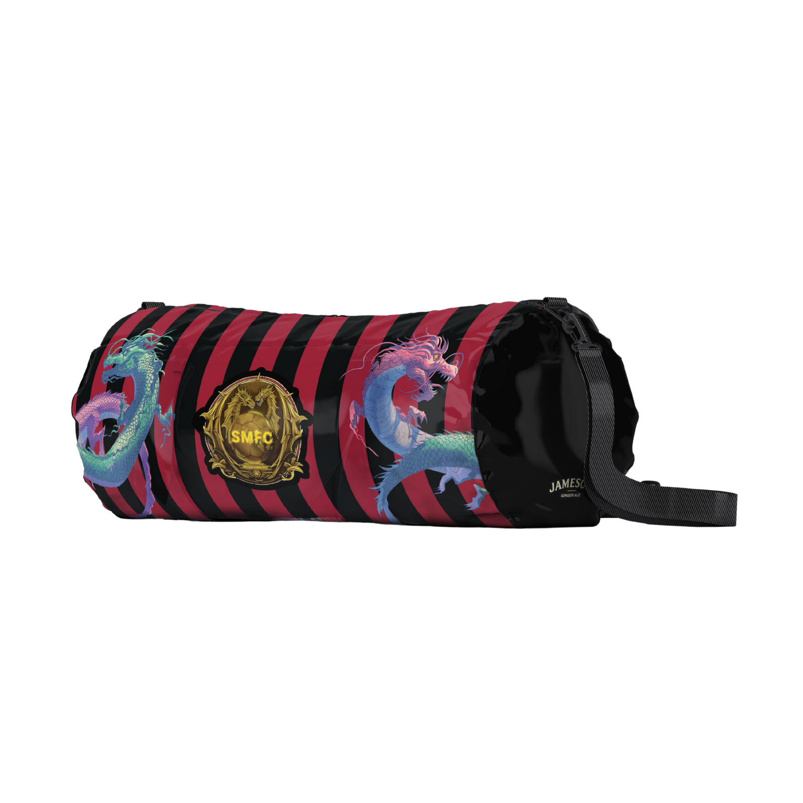A limited edition duffel bag in red and black stripes, featuring the SMFC emblem anchored by the signature dragons and Jameson Ginger Ale branding. Carry the game.