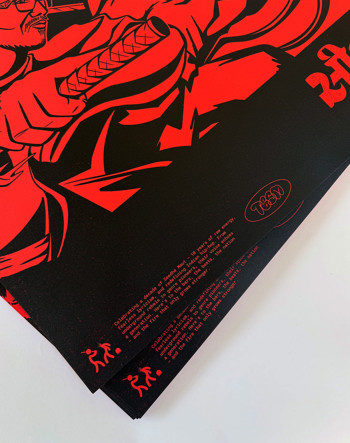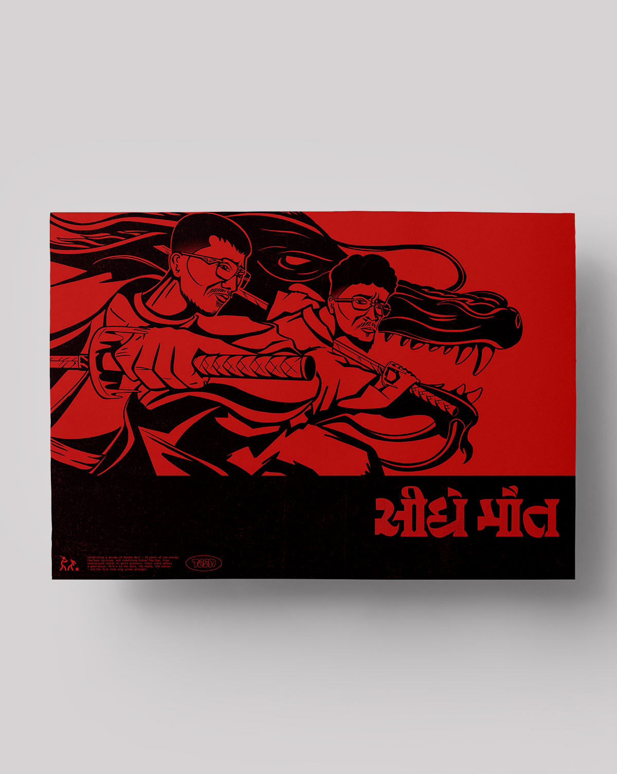 Exclusive artwork designed and illustrated by Kunal Anand with a devanagari logotype by Ishan Nakate. Printed on 200 gsm red uncoated paper stock.