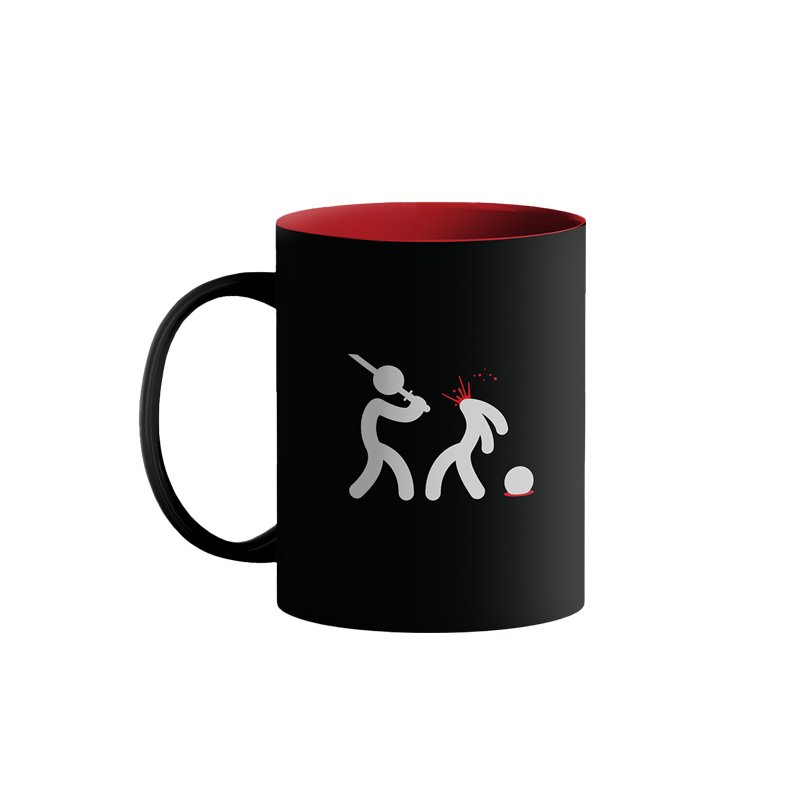 Dual colour Killing It x TBSM Mug. Ceramic-made, black exterior, red on the inside, with custom TBSM motif and Killing It stick-men from Seedhe Maut’s logo.